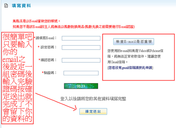 第三就是輸入你的email,你自已設的密碼,和驗證碼之後 按確定送出就搞定了!